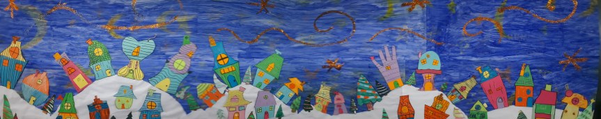 Chacun a dessiné sa maison et son sapin, puis nous avons regroupé les réalisations individuelles pour créer une œuvre collective.