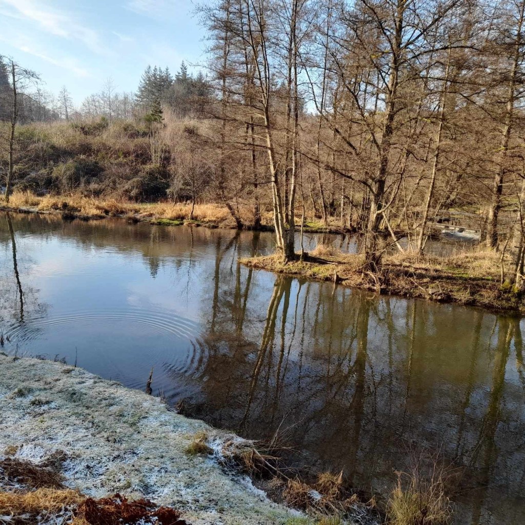 Nous avons pu contempler des exemples de symétrie dans la nature : l’étang reflète les arbres de manière symétrique.