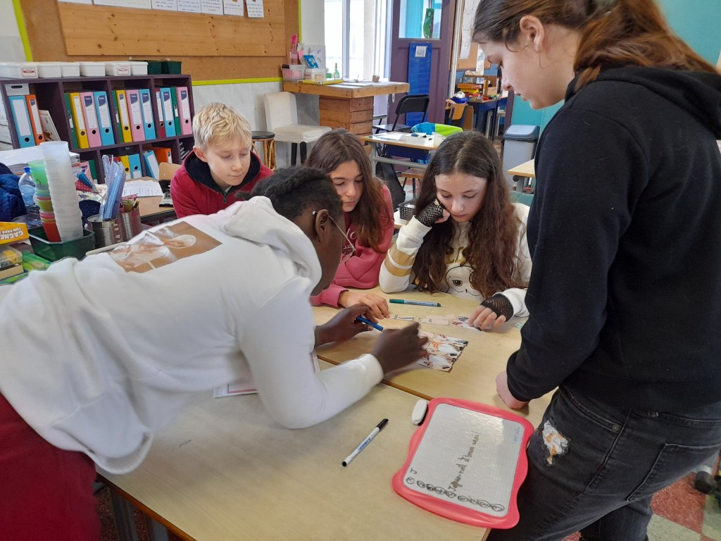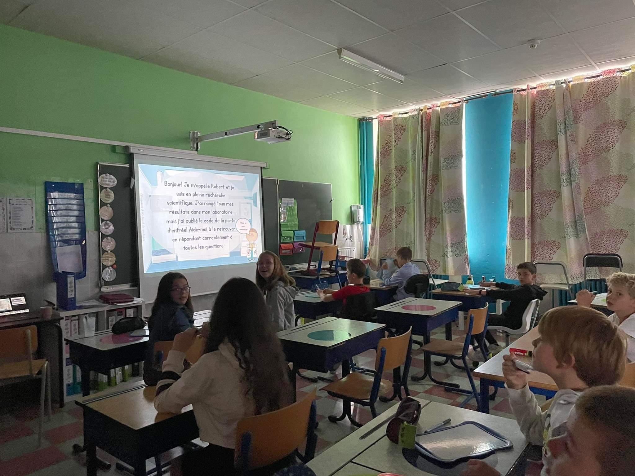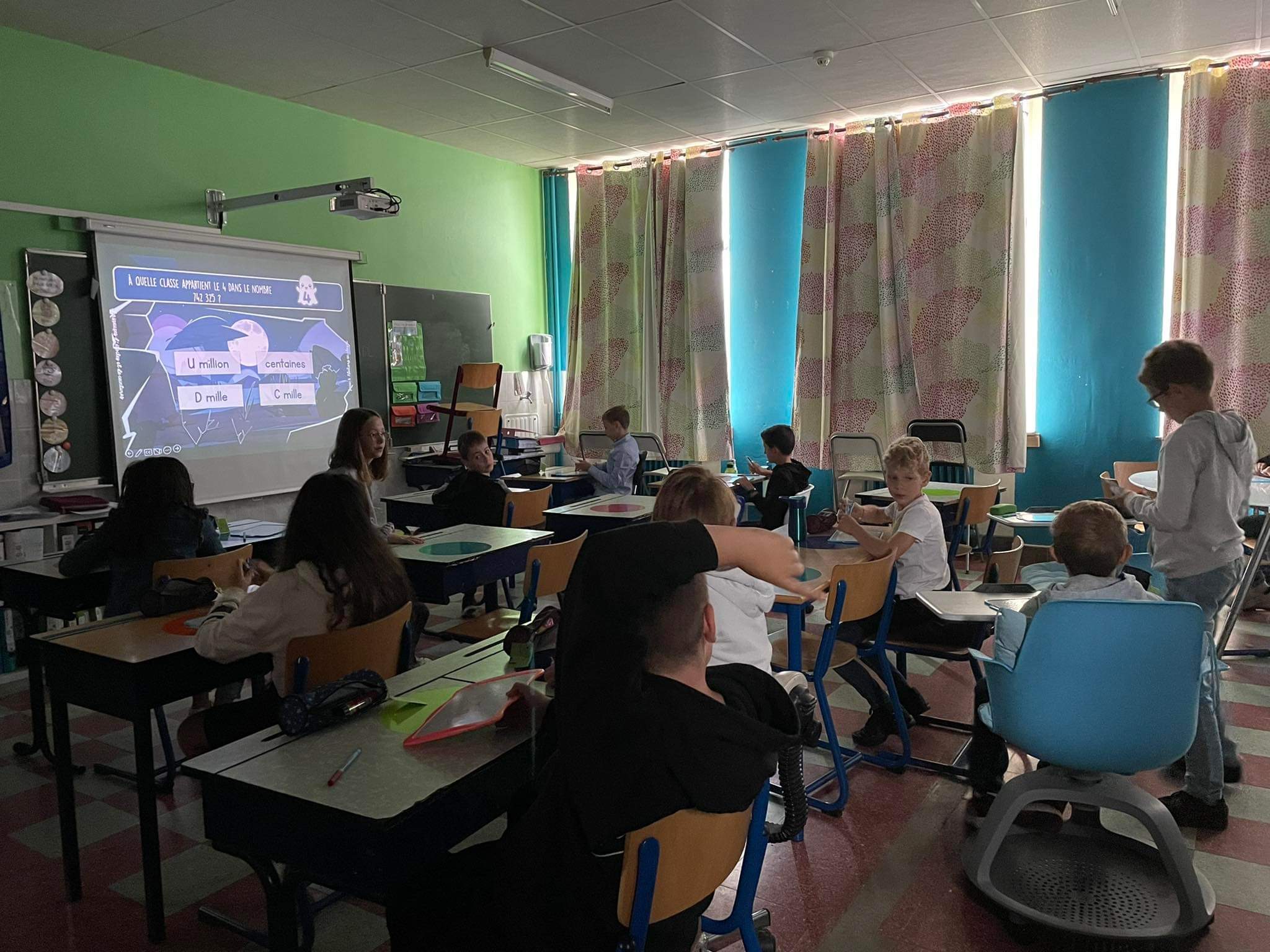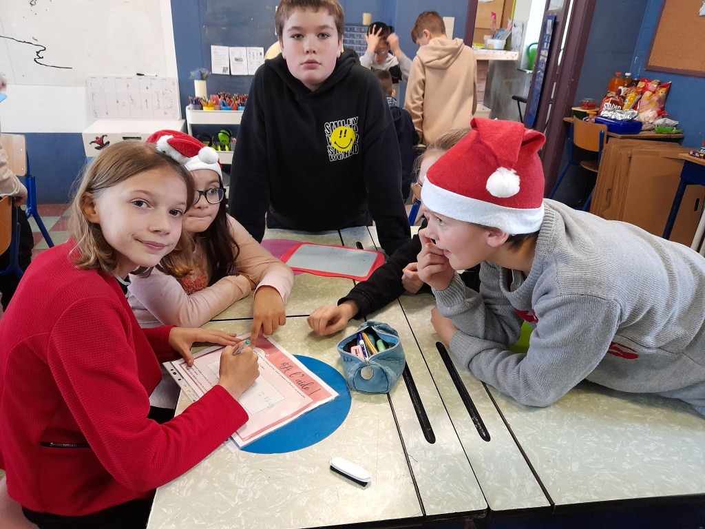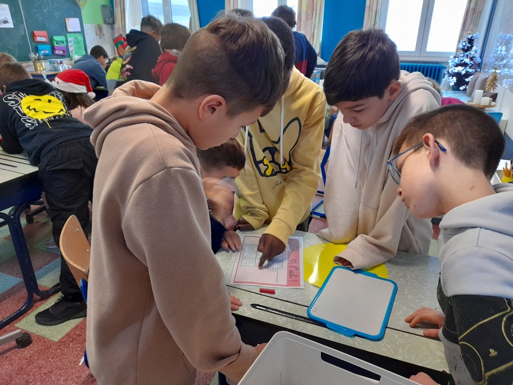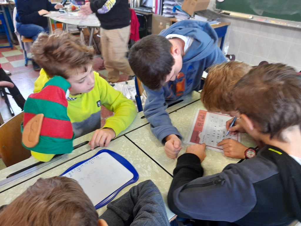 Ce matin, dans la classe de madame Sandrine, nous avons réalisé des parcours interactifs. Il s’agit d’un quizz projeté sur le tableau blanc. Nous devons écrire nos réponses sur une ardoise et la lever. Ainsi, madame peut encoder la réponse majoritaire. Le quizz la valide ou pas. Nous pouvons répondre à nouveau à la question si besoin. Cela nous permet d’évaluer nos compétences sur le sujet travaillé.