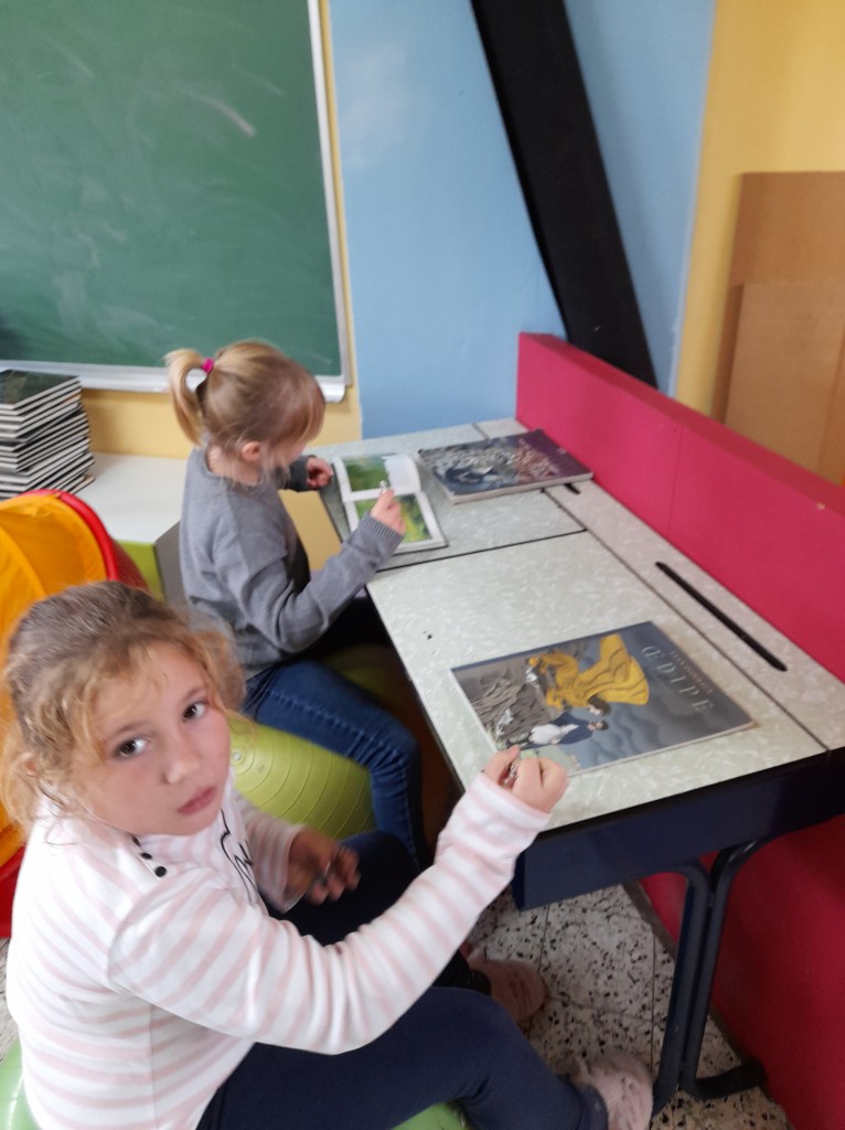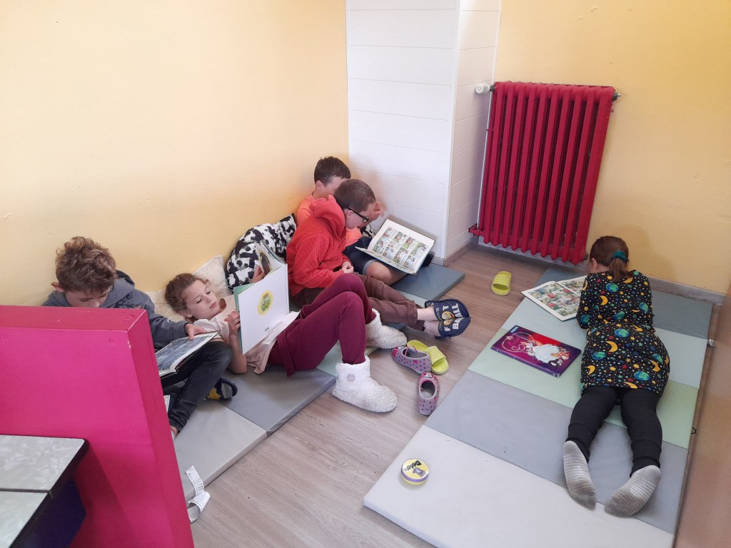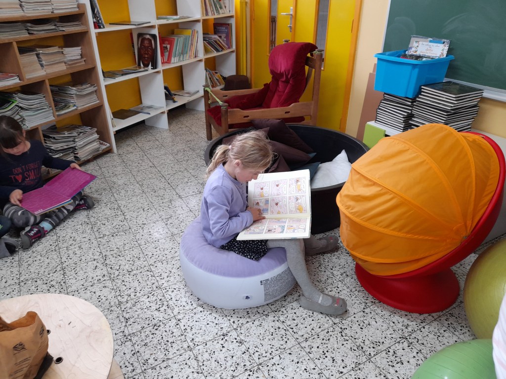 Comme chaque lundi, les élèves profitent d’un moment de lecture dans la bibliothèque de l’école.